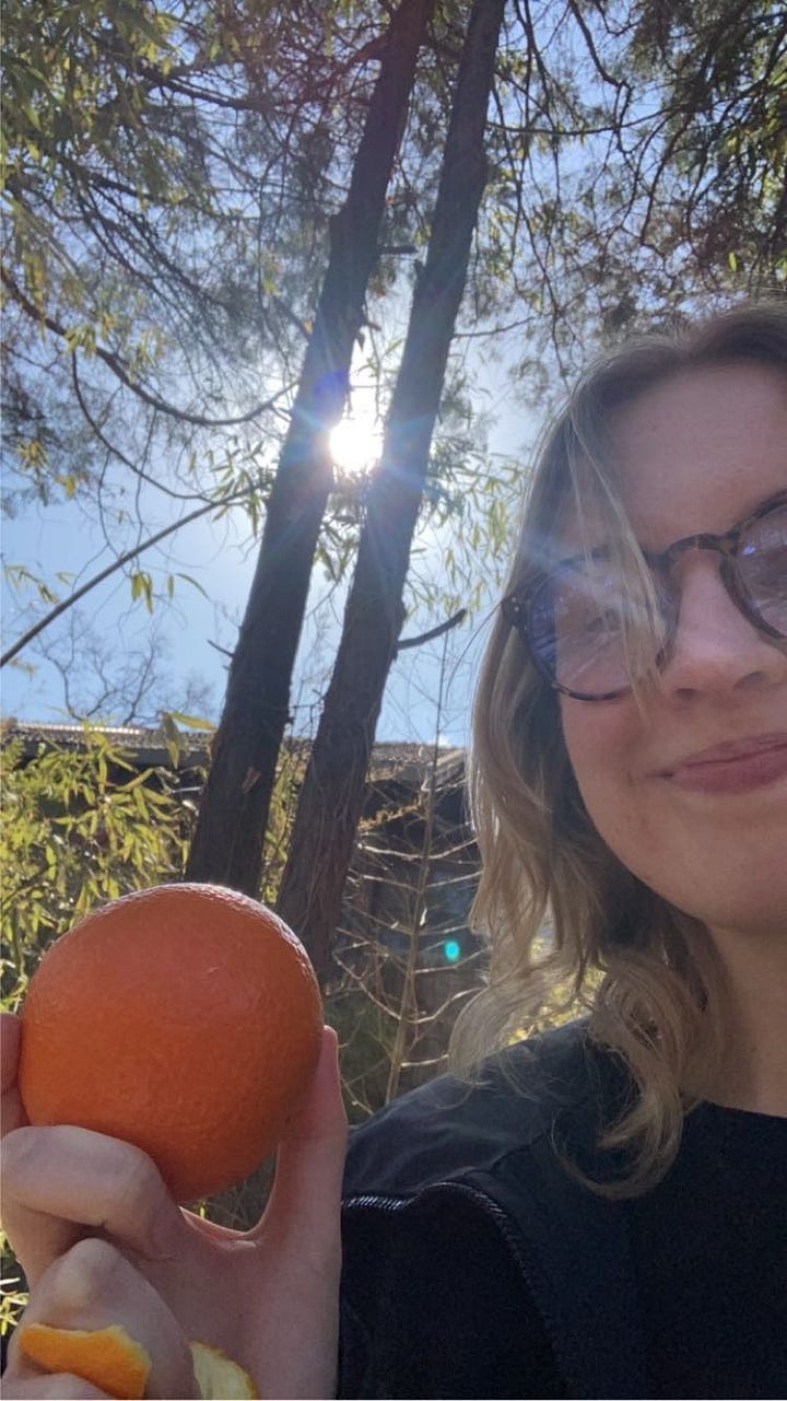 Now it was time for a picture of the orange, and me. I flipped the camera. My hair was flat (quintessential blond person experience: when it’s a little windy outside and all of a sudden your hair looks like spaghetti). I tried smoothing it out with my hand. Took some pictures where I held the orange up to my face, first facing the sun directly before deciding that having it hit one side of my face would look nicer. Then I thought the orange should be opened, and I should be eating it. I put my phone down, and started peeling the orange. The skin was thick and came off so easily, but I hardly noticed as I was thinking about angles and backgrounds. I took one bite and snapped a photo. It looked weird. I deleted it. I quickly finished the orange slice, and tried again. This process was repeated for a couple of slices.